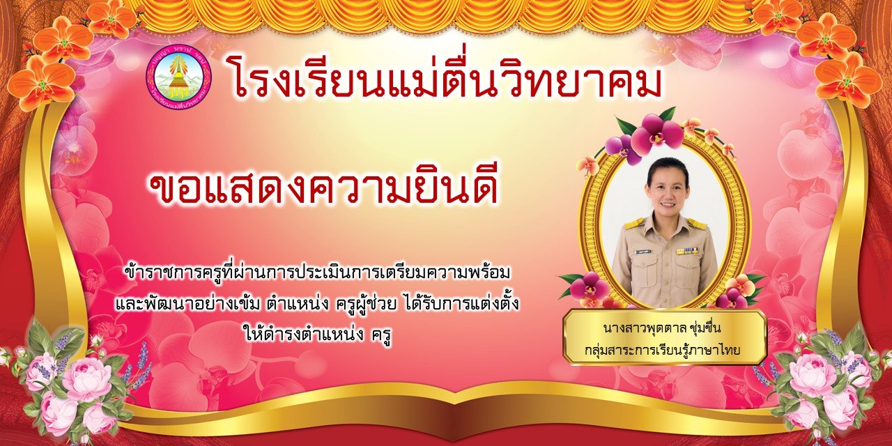 โรงเรียนแม่ตื่นวิทยาคม ขอแสดงความยินดีกับข้าราชการครูที่ผ่านการประเมินการเตรียมความพร้อมและพัฒนาอย่างเข้ม นางสาวพุดตาล ชุ่มชื่น ตำแหน่ง ครูผู้ช่วย ได้รับการแต่งตั้งให้ดำรงตำแหน่ง ครู
