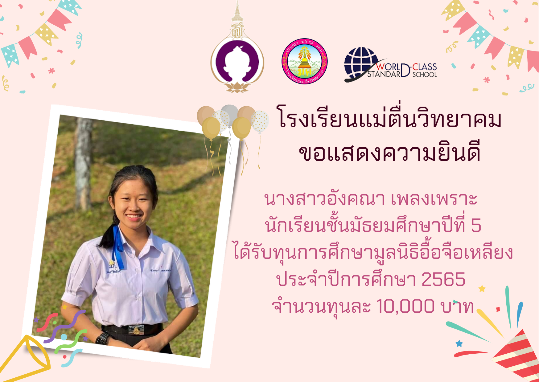 โรงเรียนแม่ตื่นวิทยาคม ขอแสดงความยินดีกับ นางสาวอังคณา เพลงเพราะ นักเรียนชั้นมัธยมศึกษาปีที่ 5 ที่ได้รับทุนการศึกษาจากมูลนิธิอื้อจือเหลียง ประจำปีการศึกษา 2565 จำนวนทุนละ 10,000 บาท