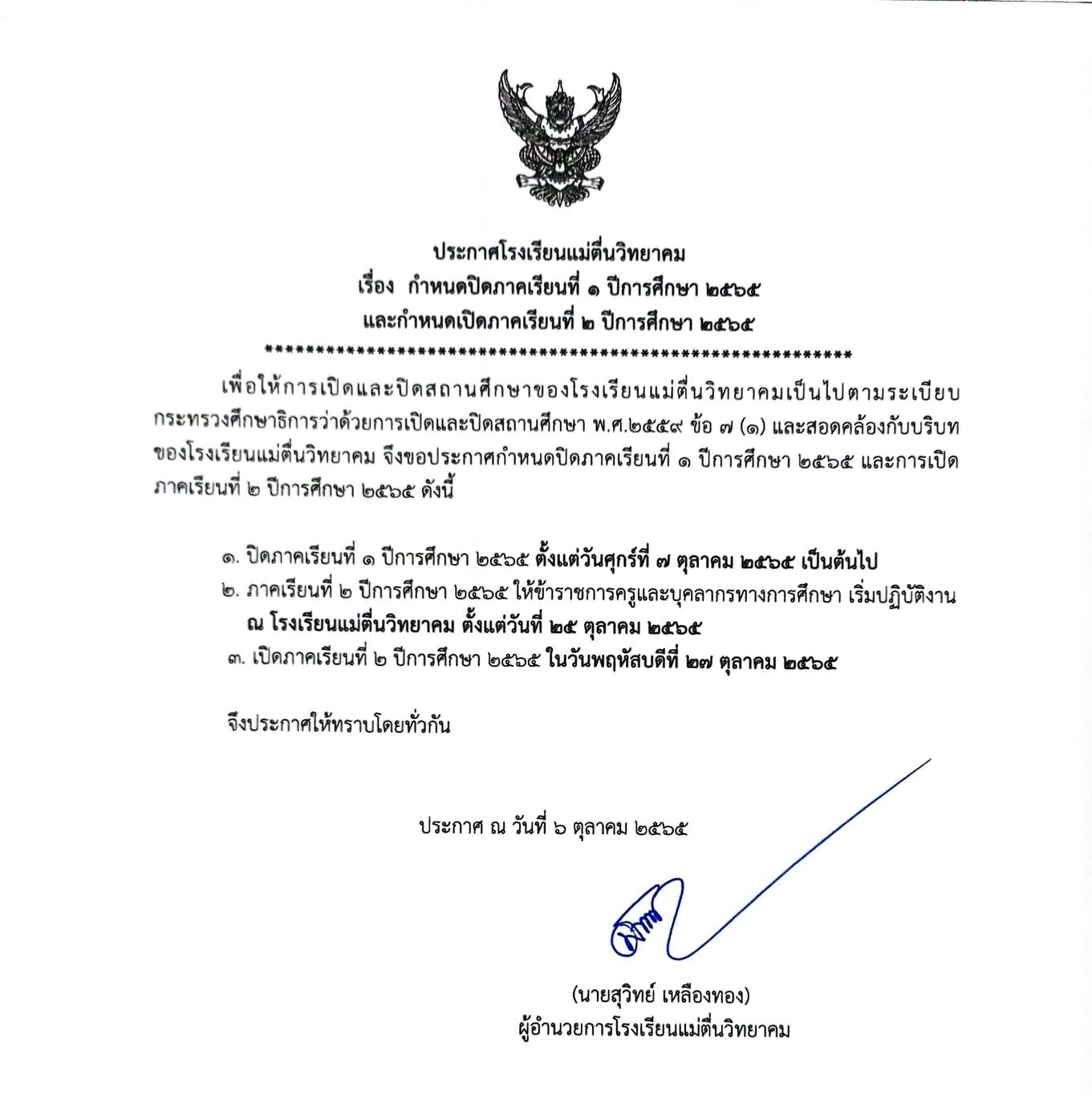 1. กำหนดปิดภาคเรียนที่ 1 ปีการศึกษา 2565 ตั้งแต่วันที่ 7 ตุลาคม 2565 เป็นต้นไป