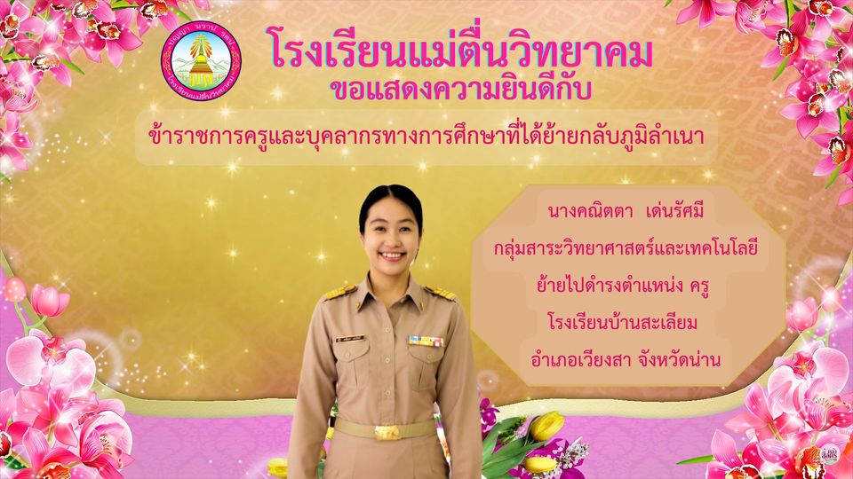 โรงเรียนแม่ตื่นวิทยาคม ขอแสดงความยินดีกับข้าราชการครูและบุคลากรทางการศึกษาที่ได้ย้ายกลับภูมิลำเนา ดังนี้ นางคณิตตา เด่นรัศมี กลุ่มสาระวิทยาศาสตร์และเทคโนโลยี ย้ายไปดำรงตำแหน่ง ครู โรงเรียนบ้านสะเลียม อำเภอเวียงสา จังหวัดน่าน