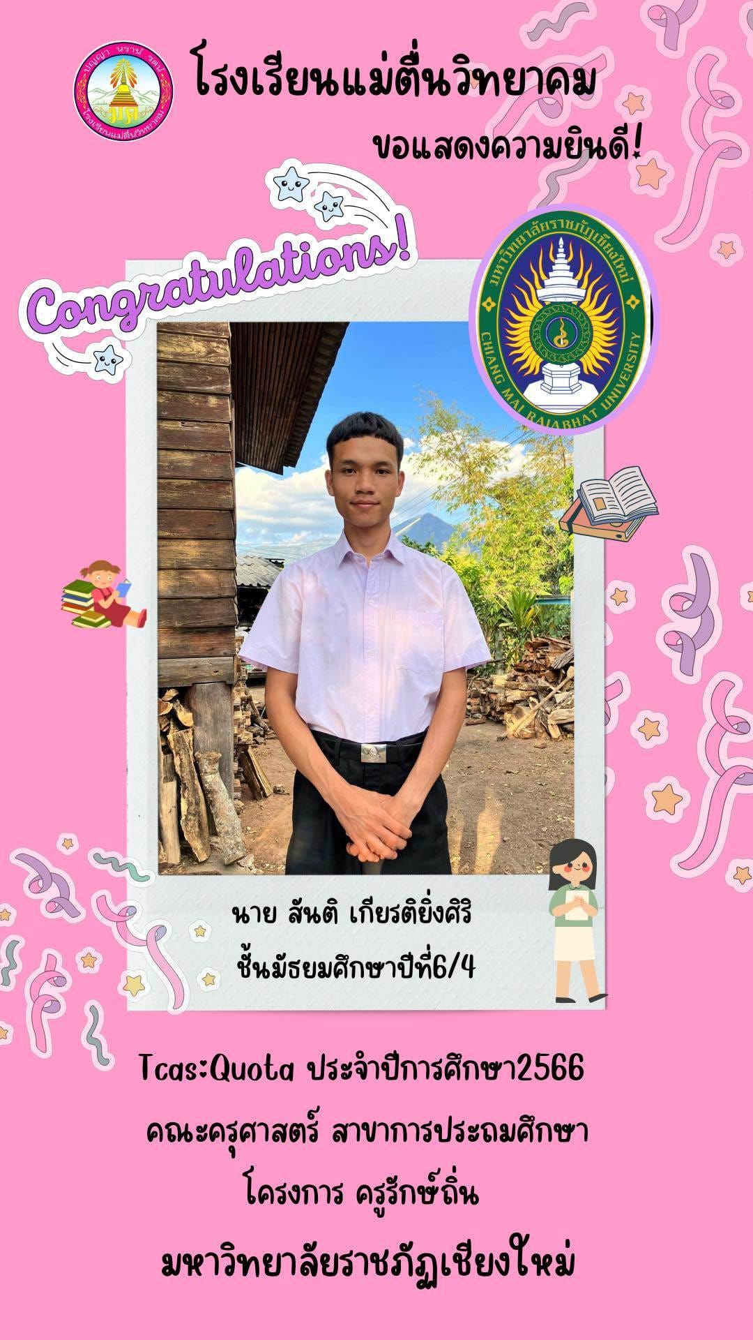โรงเรียนแม่ตื่นวิทยาคม ขอแสดงความยินดีกับนักเรียนชั้นมัธยมศึกษาปีที่ 6 ที่ผ่านการคัดเลือกเพื่อเข้าศึกษาต่อใน มหาวิทยาราชภัฏเชียงใหม่ ประจำปีการศึกษา 2566