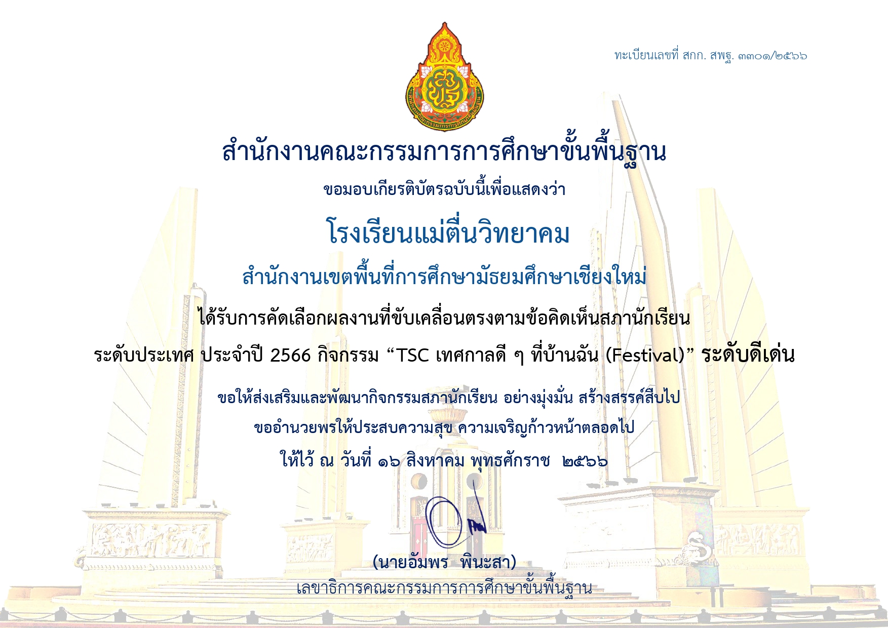ขอแสดงความยินดีกับโรงเรียนแม่ตื่นวิทยาคม สำนักงานเขตพื้นที่การศึกษามัธยมศึกษาเชียงใหม่ ที่ได้รับการคัดเลือกผลงานที่ขับเคลื่อนตรงตามข้อคิดเห็นสภานักเรียน ระดับประเทศ ประจำปี 2566 กิจกรรม “TSC เทศกาลดี ๆ ที่บ้านฉัน (Festival)” ระดับดีเด่น