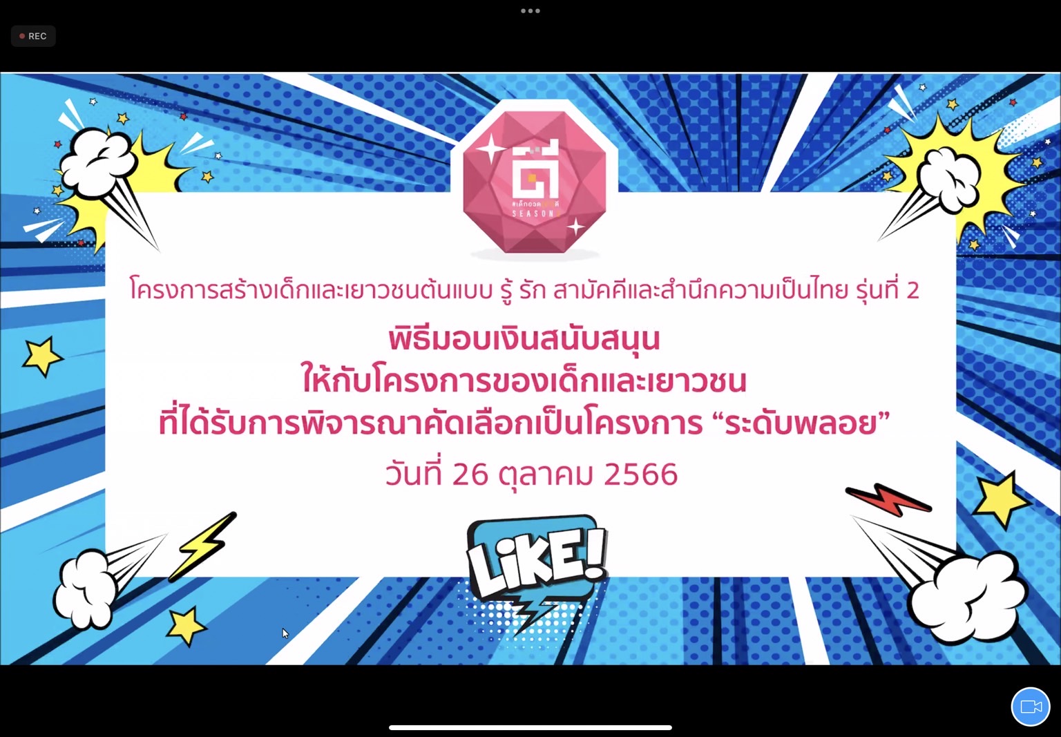 วันที่ 26 ตุลาคม 2566 โรงเรียนแม่ตื่นวิทยาคม โดย นายสิริวัฒน์ ชุ่มใจ ครูที่ปรึกษาโครงการสร้างเด็กและเยาวชนต้นแบบ รู้ รัก สามัคคี และ สำนึกความเป็นไทย ผลการพิจารณาได้รับคัดเลือกเป็นโครงการ “ระดับพลอย” นำนักเรียน เข้ารับเงินสนับสนุนจากสำนักนายก เพื่อมาพัฒนาต่อยอดโครงการ โดยผ่านนระบบ Zoom ณ ห้องประชุมหลวงปู่ทอง โรงเรียนแม่ตื่นวิทยาคม