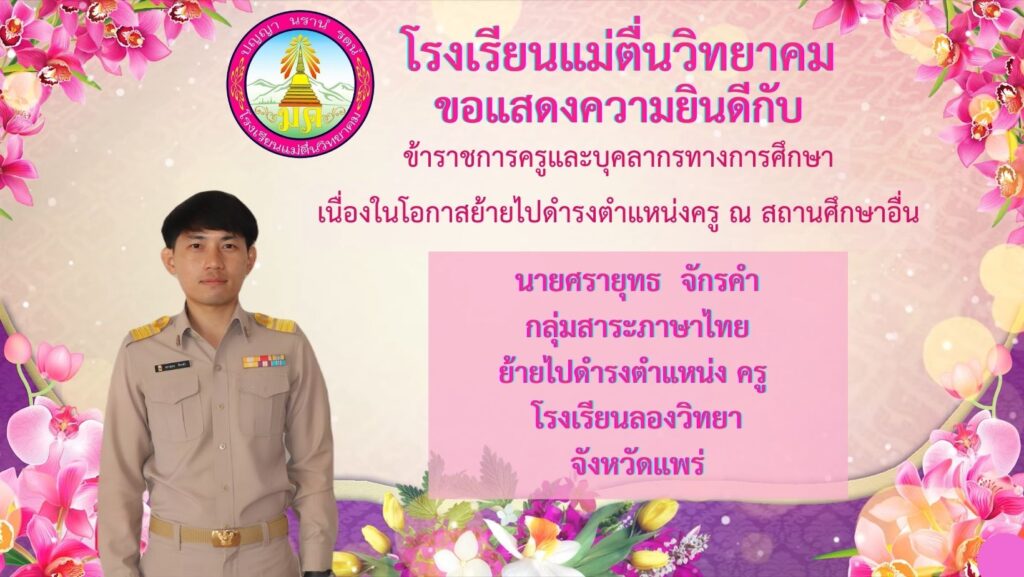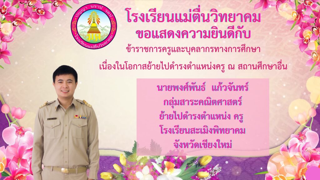 โรงเรียนแม่ตื่นวิทยาคมขอแสดงความยินดีกับข้าราชการครูและบุคลากรทางการศึกษาเนื่องในโอกาสย้ายไปดำรงตำแหน่งครู ณ สถานศึกษาอื่น 1. นายพงศ์พันธ์ แก้วจันทร์ กลุ่มสาระคณิตศาสตร์ย้ายไปดำรงตำแหน่ง ครู โรงเรียนสะเมิงพิยาคม จังหวัดเชียงใหม่ 2. นายศรายุทธ จักรคำ กลุ่มสาระภาษาไทย ย้ายไปดำรงตำแหน่ง ครู โรงเรียนลองวิทยา จังหวัดแพร่