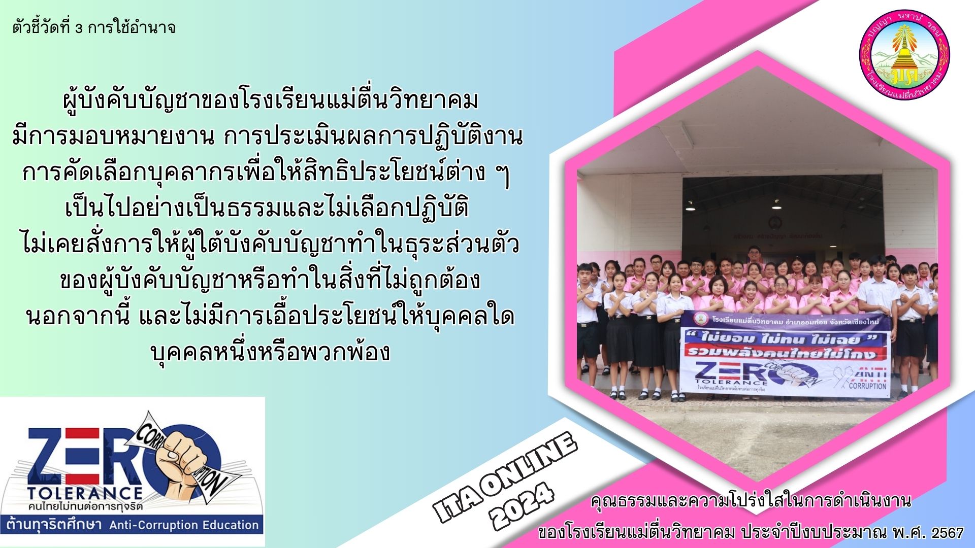 คุณธรรมและความโปร่งใสในการดำเนินงานของโรงเรียนแม่ตื่นวิทยาคม ประจำปีงบประมาณ พ.ศ. 2567 ตัวชี้วัดที่ 3 การใช้อำนาจ