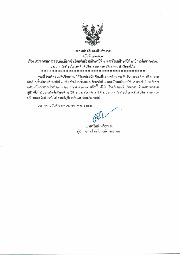 ประกาศผลการสอบคัดเลือกเข้าเรียนชั้นมัธยมศึกษาปีที่ 1 และ มัธยมศึกษาปีที่ 4 ปีการศึกษา 2564 ประเภท นักเรียนในเขตพื้นที่บริการ นอกเขตบริการและนักเรียนทั่วไป
